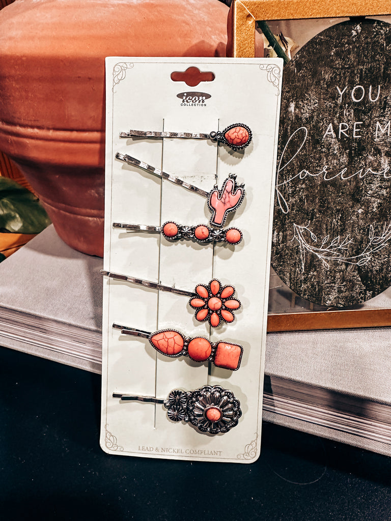 Introducing our 6 Piece Pink Hair Pin Set! Keep your hair stylishly in place this spring with these western-inspired hair pins. Perfect for any occasion, the bold pink color will add a fun pop of color to your look. Don't go another day without these must-have hair accessories!