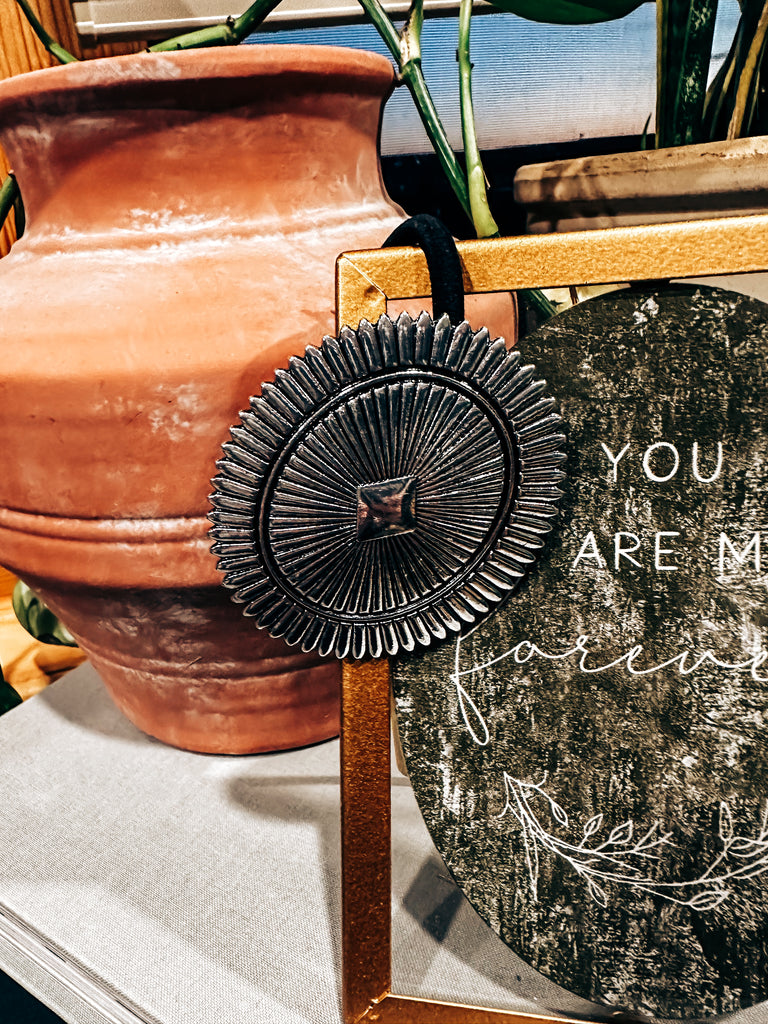 Add a touch of western flare to your hair with our Silver Stamped Concho Hair Tie. This hair tie features a stamped silver concho that adds a unique and stylish touch to any hairstyle. Plus, the elastic design ensures a secure and comfortable hold all day long. Get ready to turn heads with this must-have accessory.