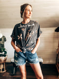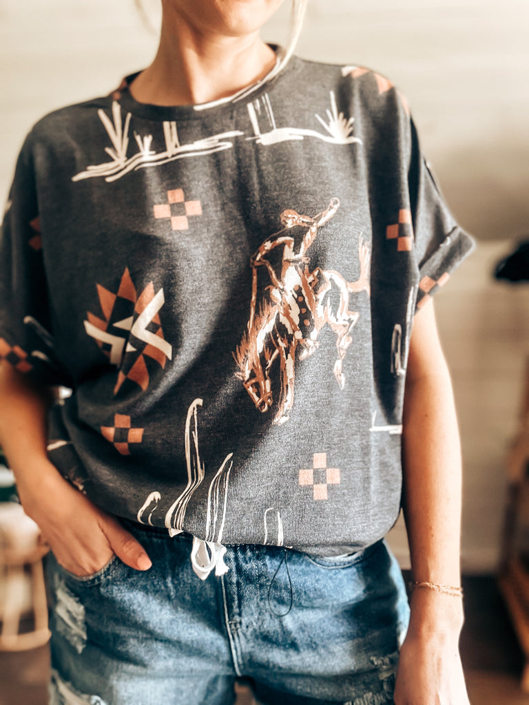 Stay cool and stylish this summer with our Back In The Saddle Top. Featuring a trendy western print and oversized fit, this graphic tee is perfect for a casual, laid-back look. Embrace the summer season with this must-have addition to your wardrobe.