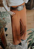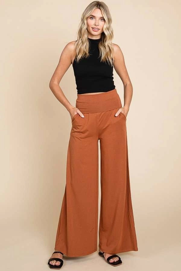 Create a stylish and comfortable look with these Casual Chic Palazzo Pants in Rust. The foldable waistband and jersey/cotton blend offer a relaxed fit for all-day wear. The wide leg palazzo design adds a touch of sophistication to any outfit. Elevate your wardrobe with the rich and versatile rust color.