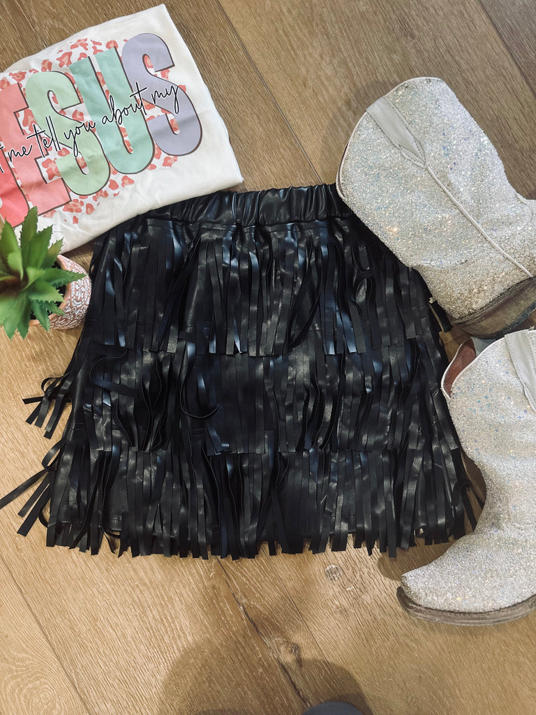 Say goodbye to boring kids' skirts with this one-of-a-kind black faux leather fringe skirt!