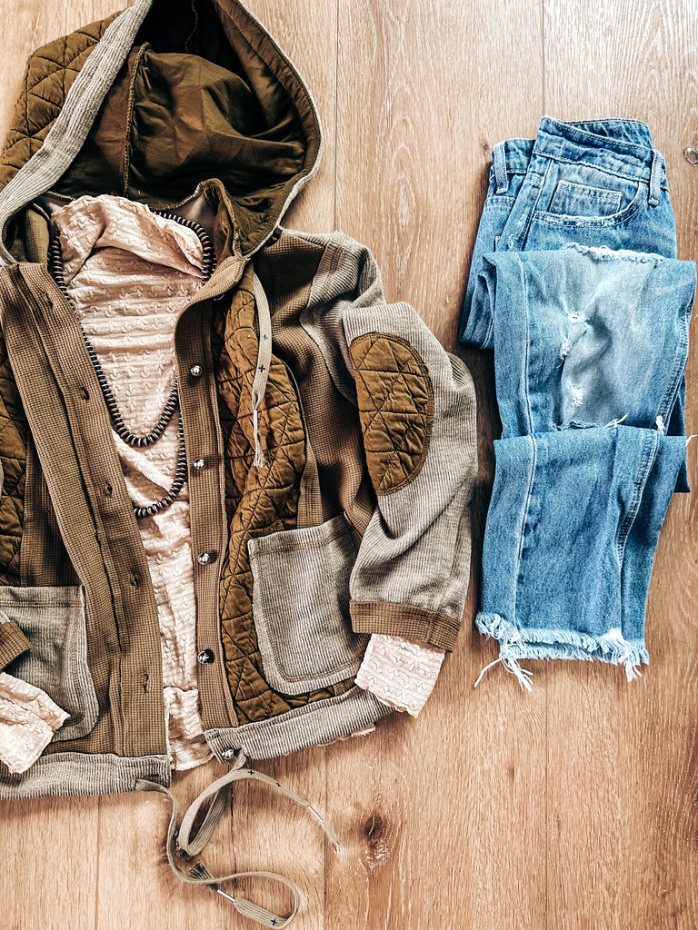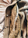 Made with a calming beige shade, this hooded jacket radiates a laid-back vibe, great for everyday outfits. Displaying intricate patchwork accents, the textured construction adds a one-of-a-kind element to this adaptable outerwear. The adjustable drawstring waist ensures a personalized fit, and the convenient pockets provide both fashion and function. Perfect for cool weather, this quilted jacket seamlessly blends warmth and style, making it a wardrobe essential.