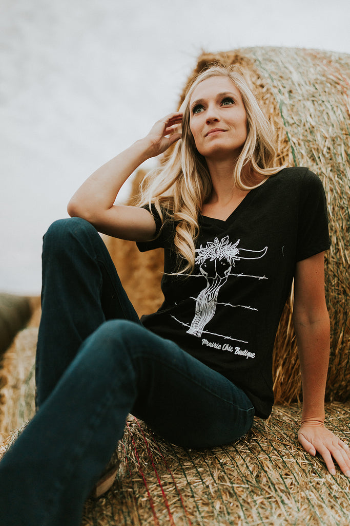 An exclusive to Prairie Chic Boutique graphic design is now available on a customer favorite v-neck dark grey tee!! This design was hand drawn by a local artist and I'm so happy with the way it turned out and I hope you love the design as much as I do. This tee is a Bell+Canvas so you know that the material is super soft and amazing fit.