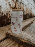 Gorgeous addition to every ranch house are these adorable and highly functional 16oz Frosted Glass Can Tumbler. Bamboo lid with straw. Hand wash only.