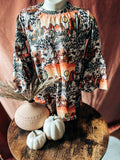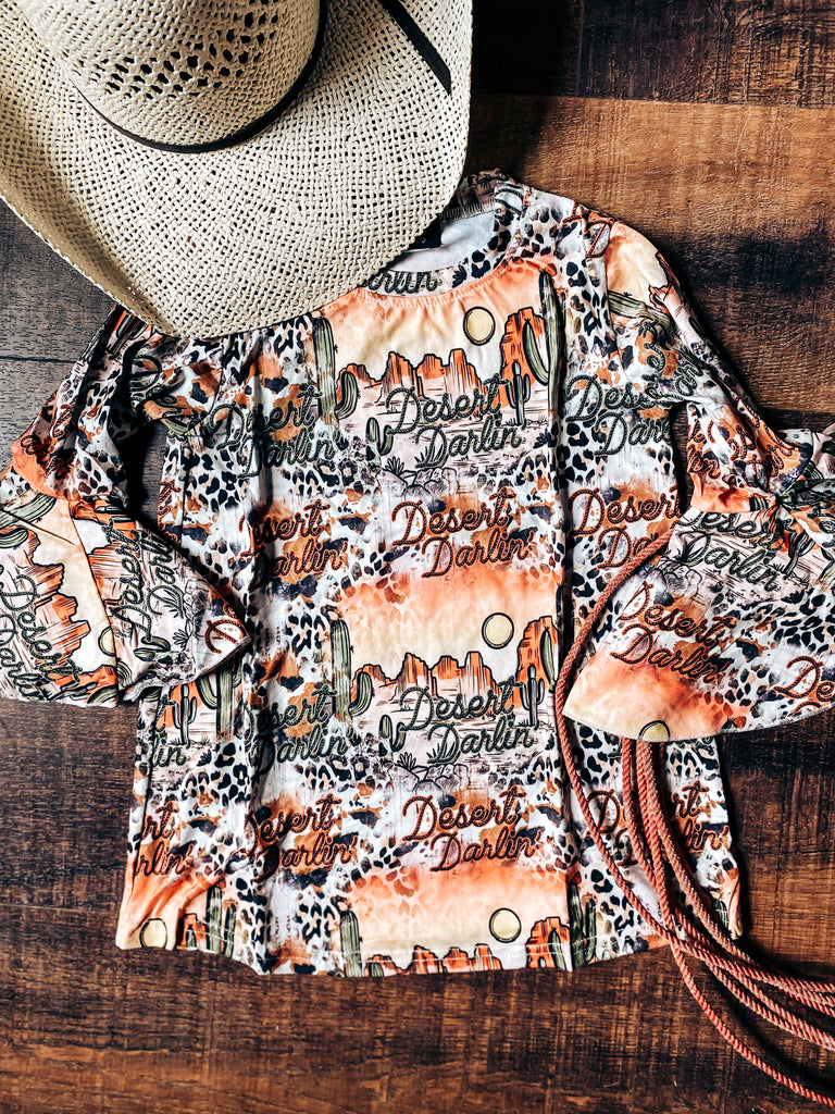 Your lil cowgirl will be the cutest at the rodeo with this bell sleeve dress. Dress print is a collage of desert scenes with cow print and Desert Darlin font. Style with leggings for when the temps get cooler.