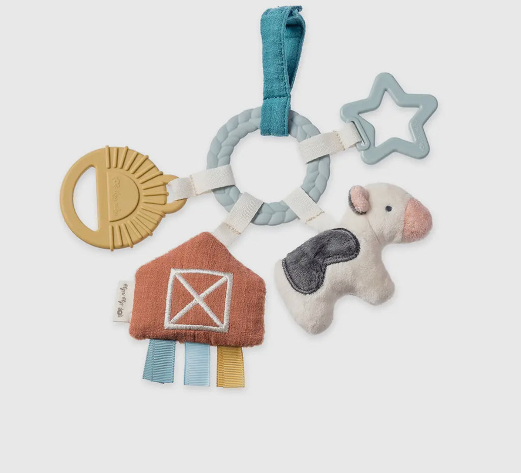 Teethe, Play & Explore! A sensory sensation, our Bitzy Busy Ring™ has all the love in the details with multiple features for baby to explore. Textured teethers and dangling toys that jingle, crinkle and delight – easily attach this toy to baby’s car seat or stroller for adventures ahead!