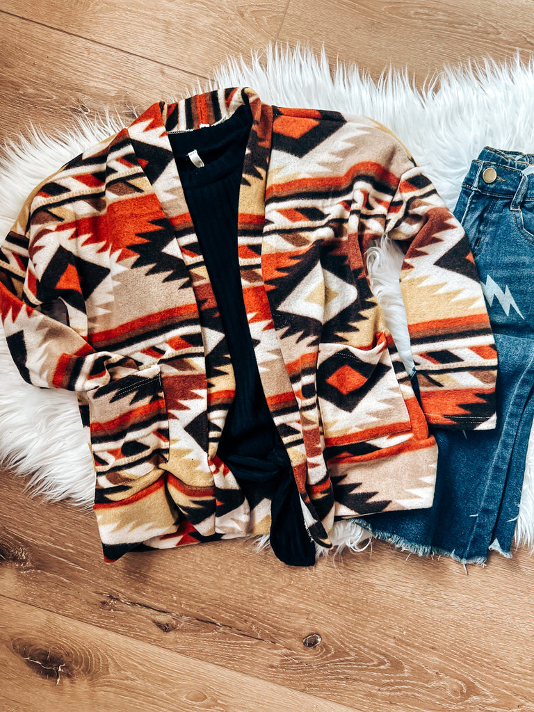 Add some western flair to your little one's winter wardrobe with our Kids Aztec Print Cardigan. The playful aztec print and cozy cardigan style make this a must-have for any cool kid. Perfect for chilly days, this unique piece will have them looking stylish and feeling warm!