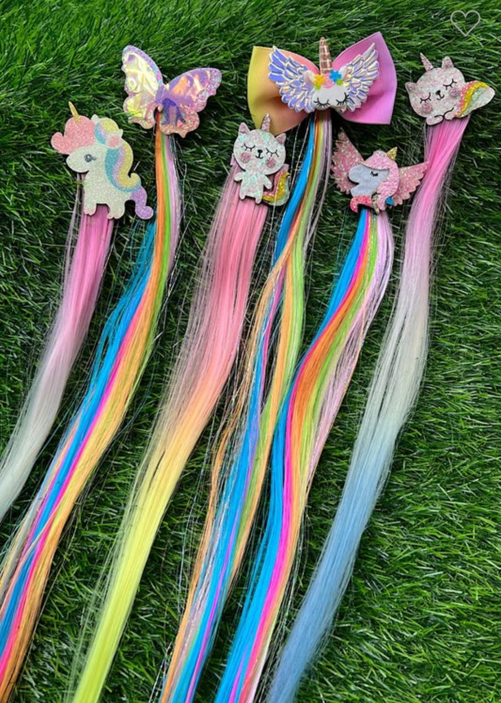 Assorted unicorn hair clips with rainbow synthetic hair.