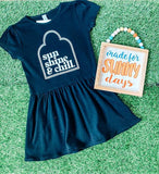 Super cute toddler dress, made of preshrunk cotton. Double-needle stitched hem ruched sleeves, dress style opening at bottom.