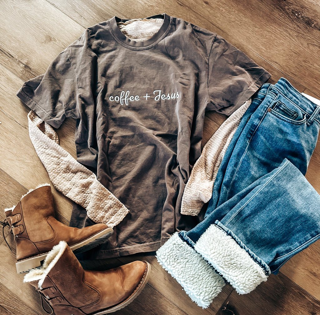 Indulge in your daily dose of caffeine and faith with our Coffee + Jesus Embroidered Tee! Made with Comfort Color Brand, this short sleeve tan tee features beautiful white embroidery that proudly displays your love for both coffee and Jesus. Perfect for any faith-based individual looking to add a touch of inspiration to their wardrobe.