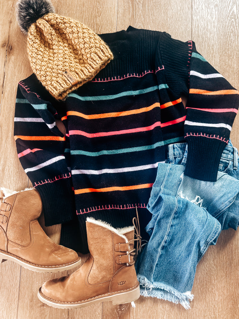 This stripe sweater is effortlessly chic with its colorful striped ribbed trim, adding a playful touch that's perfect for casual outings or cozy nights in. Designed with a round neck and long sleeves, this sweater offers both style and comfort, making it a versatile addition to your wardrobe. The sheath silhouette of this sweater flatters your figure and can be dressed up or down for any occasion.