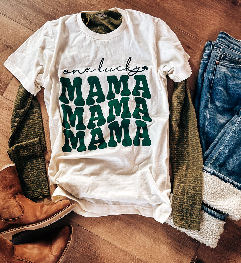 Celebrate St. Patrick's Day with our One Lucky Mama Tee! This white graphic t-shirt features vibrant green font that boldly declares your lucky status as a mama. Show off your festive spirit and stand out from the crowd in this must-have tee.