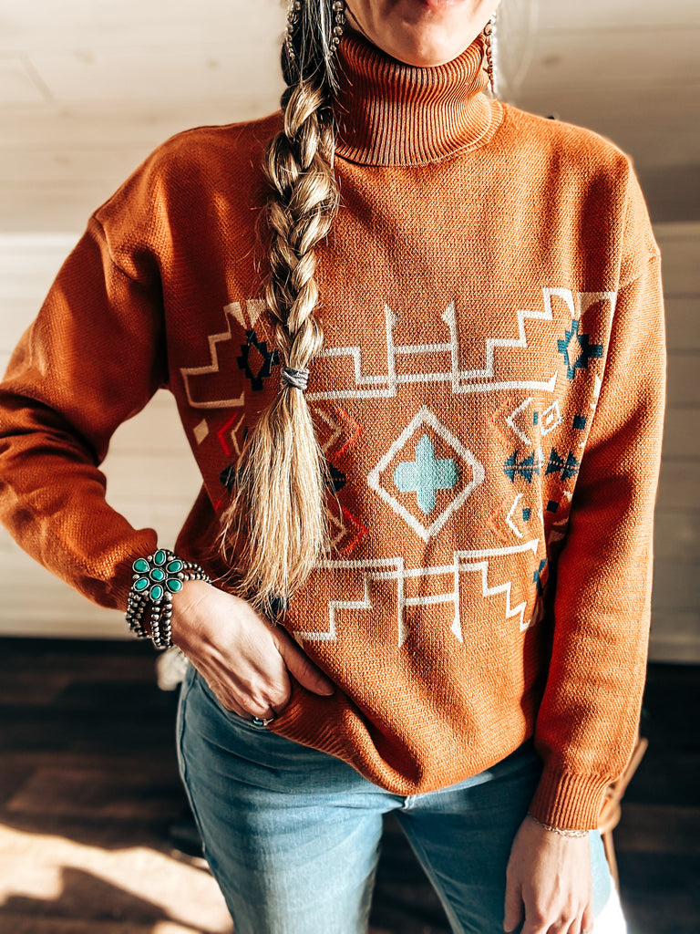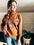 Step out in style with Tatonka's fashionable turtleneck sweater! Made from a soft, comfortable fabric, this brown turtle neck looks great and feels great too, with a bold cream, black, turquoise, and orange aztec design.